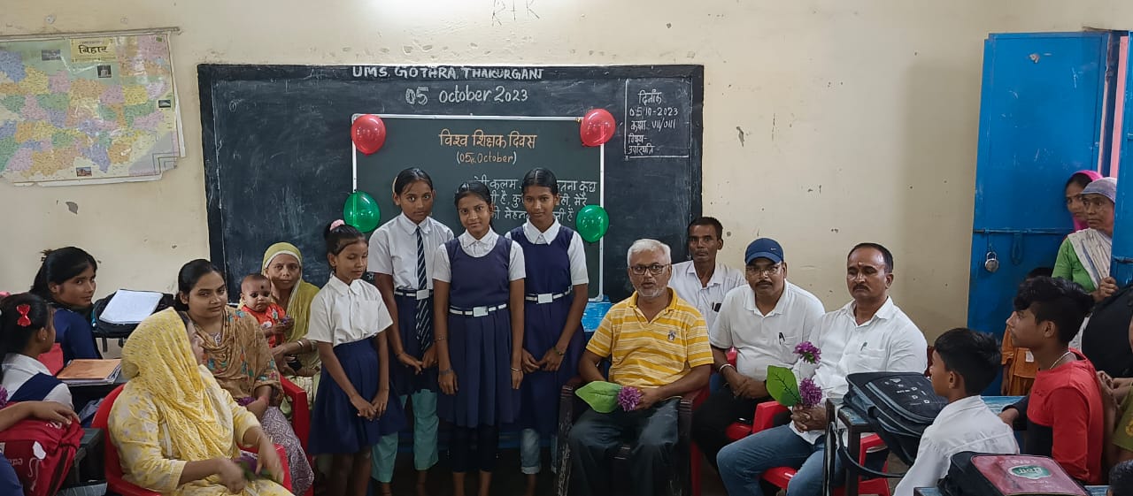 ठाकुरगंज प्रखंड के उत्क्रमित मध्य विद्यालय गोथरा में विश्व शिक्षक दिवस के अवसर पर स्कूली बच्चों ने अपने शिक्षकों के सम्मान में कार्यक्रम आयोजित कर आशीर्वाद प्राप्त किया। इस मौके पर स्कूली बच्चों द्वारा सांस्कृतिक कार्यक्रम आयोजित किए गए। इस कार्यक्रम में नृत्य व गायन के माध्यम से शिक्षकों को उनके दायित्व निर्वहन के प्रति धन्यवाद दिया गया।
