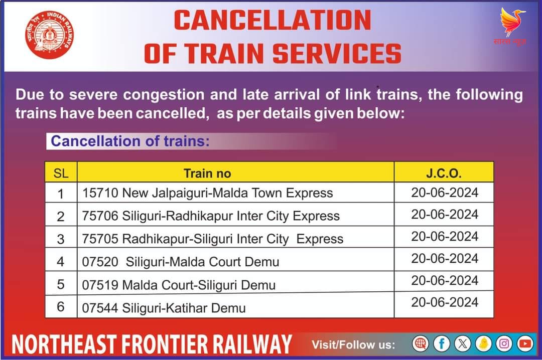 75706 सिलीगुड़ी-राधिकापुर इंटर सिटी एक्सप्रेस,75705 राधिकापुर-सिलीगुड़ी इंटर सिटी एक्सप्रेस,07520 सिलीगुड़ी-मालदा कोर्ट डेमू,07519 मालदा कोर्ट-सिलीगुड़ी डेमू,07544 सिलीगुड़ी-कटिहार डेमू,यह ट्रेन गुरुवार 20/06/2024 को रद्द रहेगी।