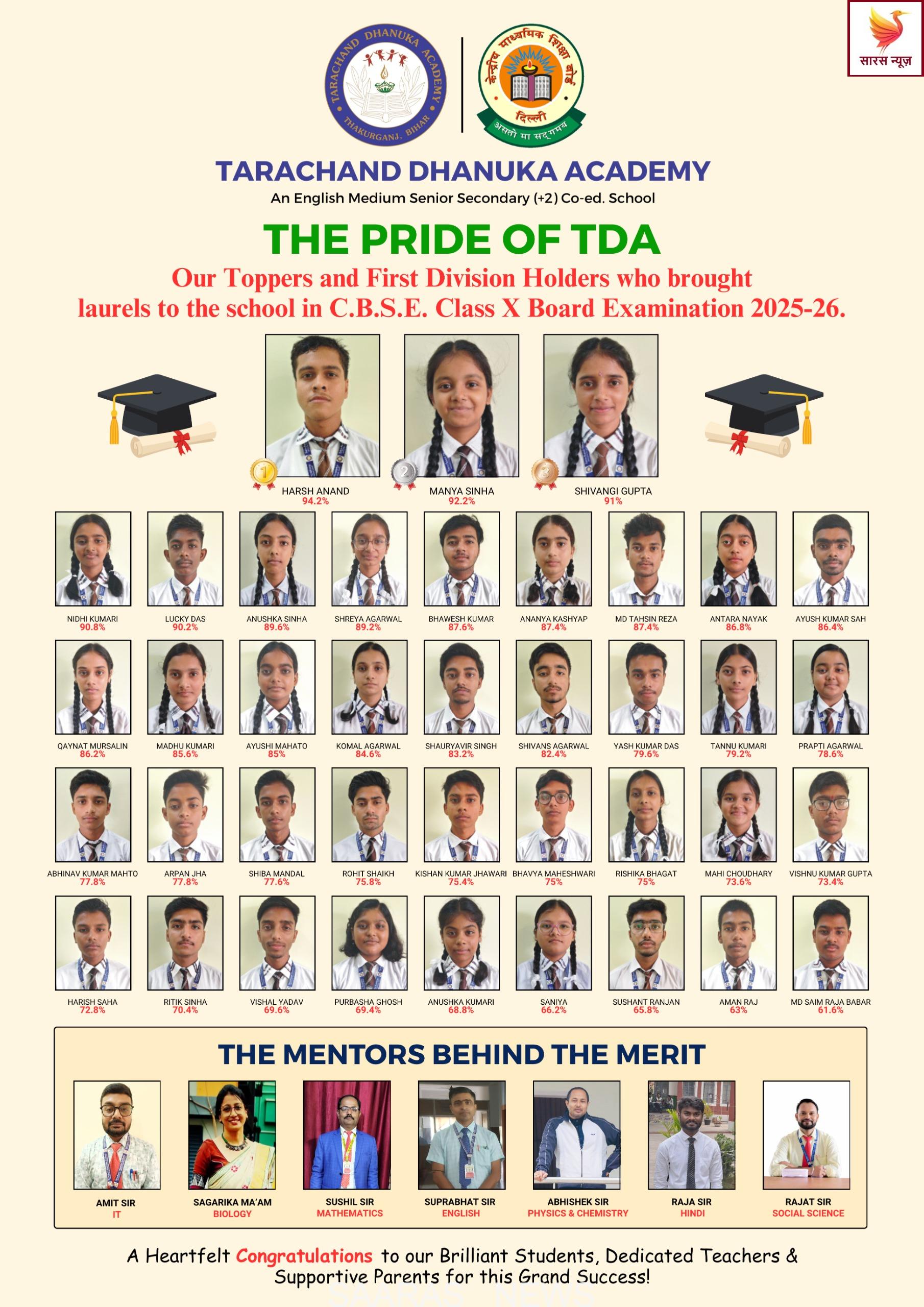 ठाकुरगंज के प्रतिष्ठित शैक्षणिक संस्थान Tarachand Dhanuka Academy (TDA) ने एक बार फिर अपने शानदार प्रदर्शन से पूरे बिहार-झारखंड में अपनी अलग पहचान कायम की है। CBSE बोर्ड परीक्षा 2025-26 के घोषित परिणामों में विद्यालय ने लगातार पांचवें वर्ष 100% पास रिजल्ट हासिल कर एक नया कीर्तिमान स्थापित किया है।विद्यालय प्रबंधन के अनुसार, इस वर्ष के परिणाम न सिर्फ सफलता की कहानी कहते हैं, बल्कि छात्रों की मेहनत, शिक्षकों के समर्पण और अनुशासन का भी प्रमाण हैं। TDA ने खुद को केवल किशनगंज ही नहीं, बल्कि बिहार-झारखंड के टॉप 2% CBSE स्कूलों में मजबूती से बनाए रखा है।परिणामों पर नजर डालें तो 90.7% विद्यार्थियों ने प्रथम श्रेणी प्राप्त की, जबकि हर 10 में से 9 छात्र उत्कृष्ट अंकों के साथ सफल हुए। वहीं 28 विद्यार्थियों ने 75% से अधिक अंक प्राप्त कर डिस्टिंक्शन हासिल किया, जो विद्यालय के उच्च शैक्षणिक स्तर को दर्शाता है। इस वर्ष के टॉपर्स में हर्ष आनंद ने 94.2% अंक प्राप्त कर प्रथम स्थान हासिल किया। मान्या सिन्हा 92.2% अंकों के साथ दूसरे स्थान पर रहीं, जबकि शिवांगी गुप्ता ने 91% अंक प्राप्त कर तीसरा स्थान प्राप्त किया। इन छात्रों की उपलब्धि ने विद्यालय का नाम गौरवान्वित किया है।विद्यालय प्रबंधन ने सभी सफल छात्रों, उनके अभिभावकों और शिक्षकों को इस उपलब्धि के लिए बधाई दी है। साथ ही यह भी कहा कि TDA का लक्ष्य केवल अच्छे परिणाम देना नहीं, बल्कि विद्यार्थियों को अनुशासन, मेहनत और सही मार्गदर्शन के साथ जीवन में आगे बढ़ने के लिए तैयार करना है।