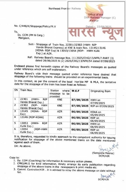 रेलवे बोर्ड के निर्देश और स्थानीय जनप्रतिनिधियों के अनुरोध पर लिया गया यह फैसला यात्रियों की सुविधा को ध्यान में रखकर किया गया है। अधिसूचना के मुताबिक, वंदे भारत एक्सप्रेस के अलावा कुछ अन्य ट्रेनों को भी किशनगंज (KNE) और आज़मपुर (AZR) स्टेशनों पर ठहराव दिया गया है।