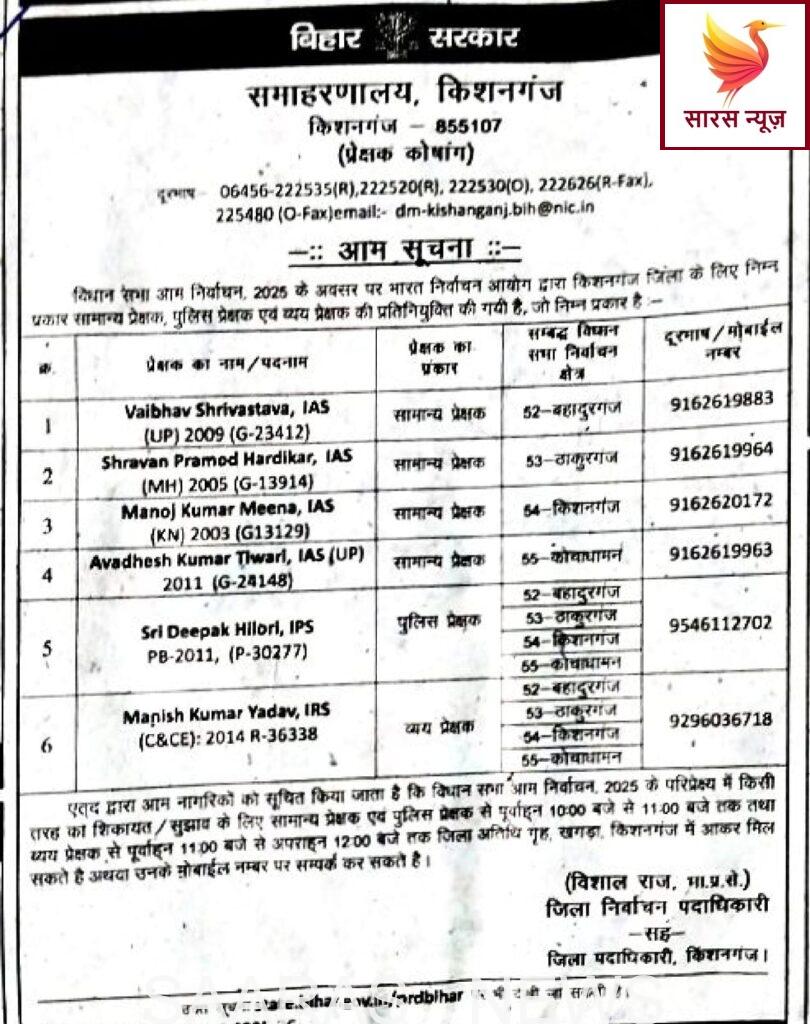 आगामी विधानसभा आम निर्वाचन 2025 को लेकर भारत निर्वाचन आयोग ने किशनगंज जिले के लिए विभिन्न श्रेणियों में पर्यवेक्षकों की नियुक्ति की है। इस संबंध में जिला निर्वाचन पदाधिकारी सह जिलाधिकारी विशाल राज द्वारा जारी आम सूचना में प्रशासनिक, पुलिस एवं व्यय पर्यवेक्षकों के नामों की घोषणा की गई है।