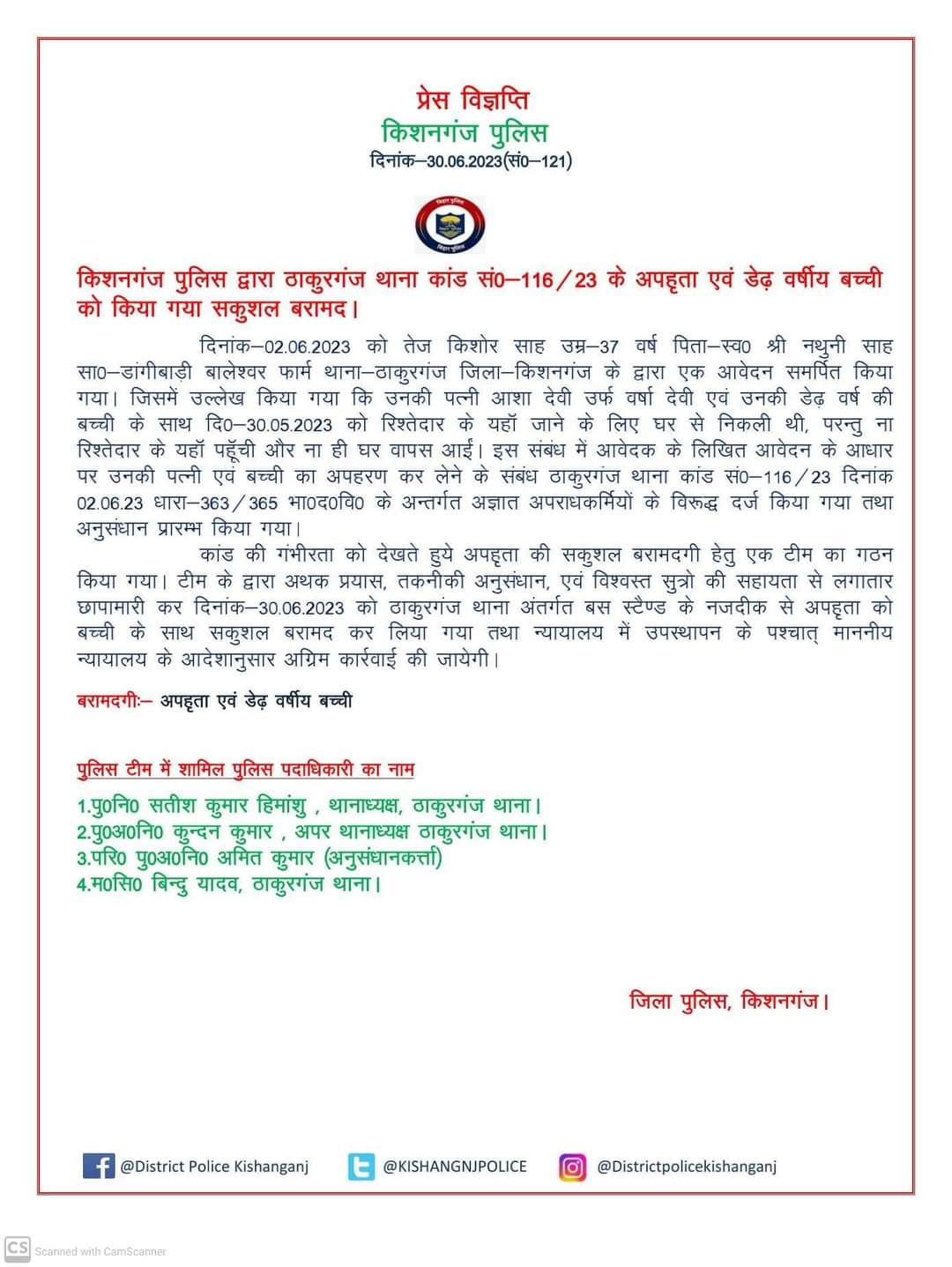 Read MorePost Views: 257 सारस न्यूज, किशनगंज। ठाकुरगंज पुलिस ने करीब एक माह पूर्व अपहृता एवं ढेर वर्षीय बच्ची को बरामद…