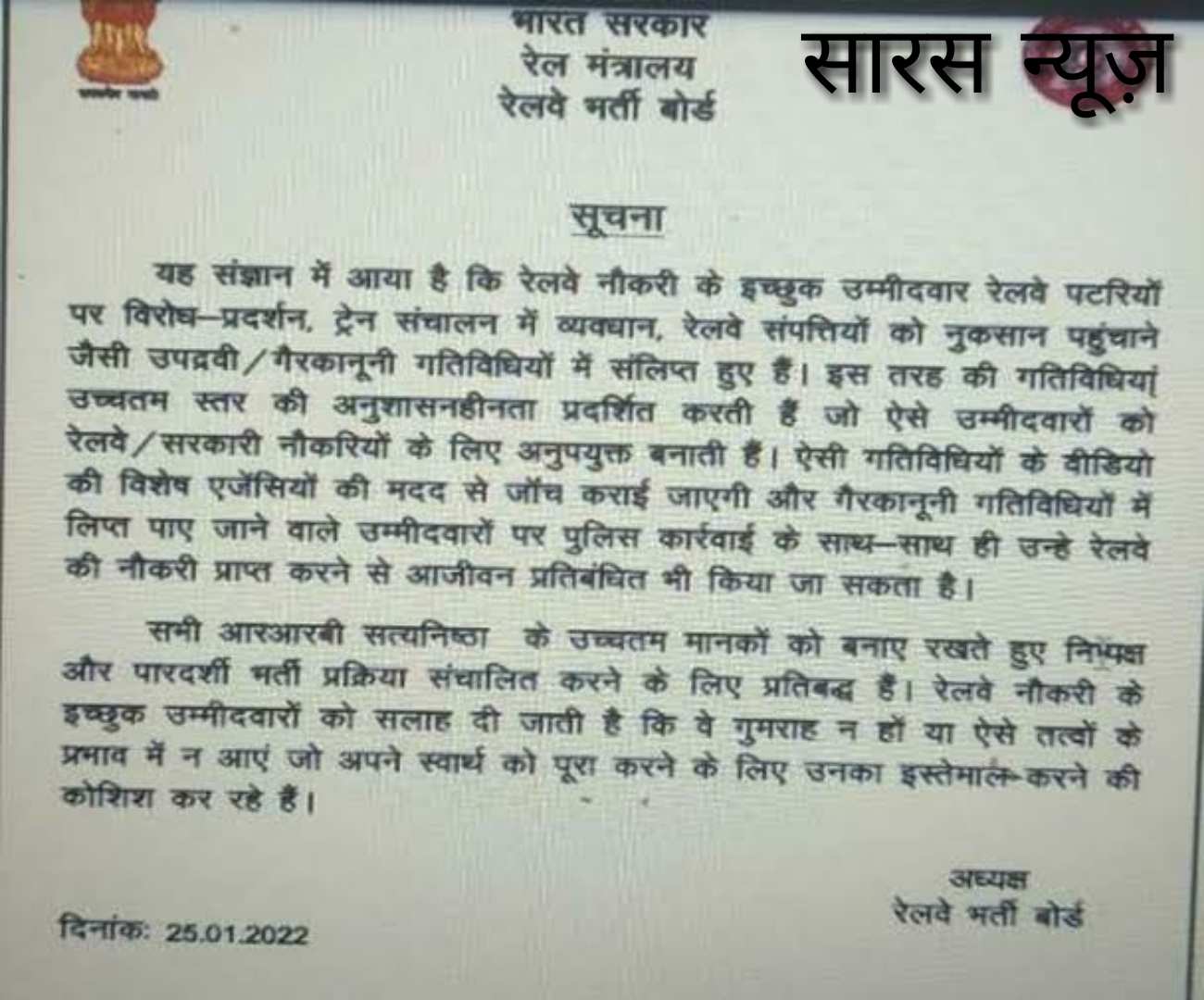 रेलवे एनटीपीसी परीक्षा को लेकर छात्रों द्वारा किए जा रहे आंदोलन पर रेलवे ने सख्त रवैया अपनाया है। आंदोलन करने वाले छात्रों की वीडियो अथवा सीसी टीवी कैमरे से पहचान करायी जाएगी। इन लोगों को रेलवे में नौकरी की पात्रता से आजीवन वंचित किया जाएगा। रेलवे भर्ती बोर्ड के अध्यक्ष की ओर से आधिकारिक बयान जारी कर ऐसे छात्रों को चेतावनी देते हुए कहा गया है कि छात्रों का यह आंदोलन चरम अनुशासनहीनता का उदाहरण है।