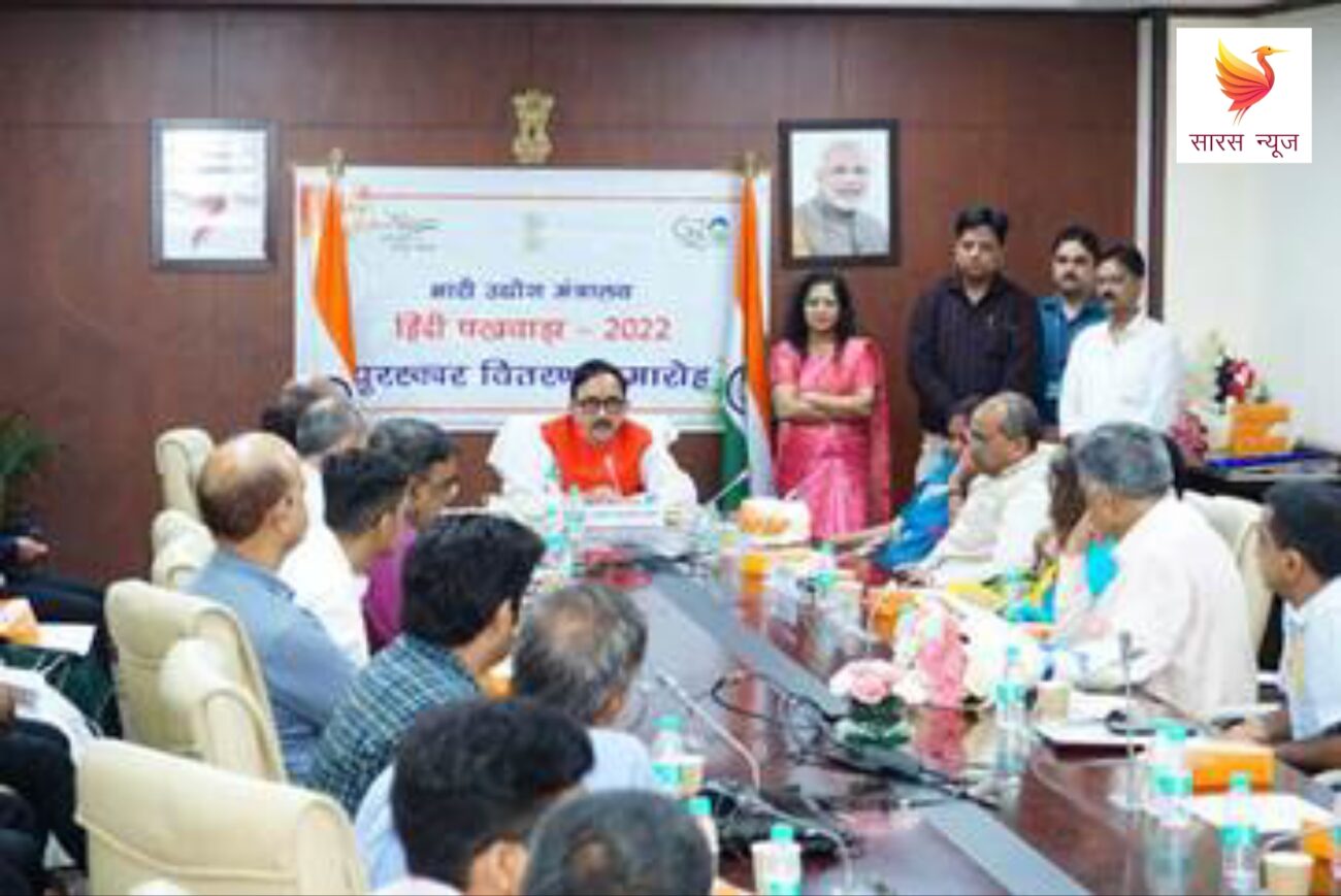 भारी उद्योग मंत्रालय में आज हिंदी पखवाड़ा पुरस्कार वितरण समारोह का भव्य आयोजन किया गया। समारोह में भारी उद्योग मंत्री डॉ. महेन्द्र नाथ पांडेय ने पिछले वर्ष आयोजित पखवाड़े की 9 प्रतियोगिताओं के 25 विजेताओं को प्रशस्ति-पत्र प्रदान किए। इनमें अनुच्छेद लेखन, अनुवाद, वाचन, टिप्पण-प्रारुपण, आशुभाषण और श्रुतलेखन प्रतियोगिताएं शामिल हैं। इनके अतिरिक्त, सितंबर-2022 माह के दौरान हिंदी में अधिकाधिक सरकारी कामकाज के लिए भी चार कर्मियों को पुरस्कृत किया गया। संयुक्त सचिव विजय मित्तल ने कहा कि पहली बार, मंत्रालय में चार अनुभागों को भी पुरस्कृत किया गया है। कार्यक्रम में, राज्य सभा के संसद सदस्य सीमा द्विवेदी और सुजीत कुमार भी उपस्थित थे। इनके अलावा, मंत्रालय की हिंदी सलाहकार समिति के दो सदस्य डॉ. वंदना पांडेय और डा. पूरनचंद टंडन भी कार्यक्रम में मौजूद थे। इस अवसर पर सांसद सुजीत कुमार ने कहा कि हर देश अपनी भाषा में ही प्रगति करता है। चीन, जापान और जर्मनी आदि में तकनीकी पढ़ाई भी उनकी मातृभाषा में ही होती है, इसलिए हम वैसी ही सफलता हिंदी का उपयोग करके भी हासिल कर सकते हैं। उन्होंने कहा कि स्वयं उड़िया भाषी होने के बावजूद उन्हें हिंदी पसंद है। सांसद सीमा द्विवेदी ने विश्वास व्यक्त किया कि मंत्रीजी के हाथों से पुरस्कार पाने से प्रतिभागी आगे भी इन प्रतियोगिताओं में बढ़-चढ़कर हिस्सा लेने के लिए प्रेरित होंगे। उन्होंने यह भी कहा कि हिंदी में बात करने का मतलब कम शिक्षित होना माना जाता था, लेकिन  भारी उद्योग मंत्रालय में समस्त कामकाज हिंदी में करवाने का बीड़ा उठाकर भारी उद्योग मंत्रीजी ने इस धारणा को तोड़ा है। भारी उद्योग मंत्री डॉ. महेन्द्र नाथ पांडेय ने कहा कि प्रधानमंत्रीजी ने भी इस बात पर ज़ोर दिया है कि लोक कल्याणकारी योजनाओं की जानकारी जनता को जन-सामान्य की भाषा में दिया जाए। उन्होंने जोर देकर कहा कि केंद्र सरकार क्षेत्रीय भाषाओं के खिलाफ नहीं, बल्कि उसके पक्ष में है। डॉ. पाण्डेय ने कहा कि भारतीयता के बोध के लिए हिंदी सबसे अच्छी भाषा है और इसलिए इसे वैश्विक स्वीकार्यता के स्तर पर ले जाना है।