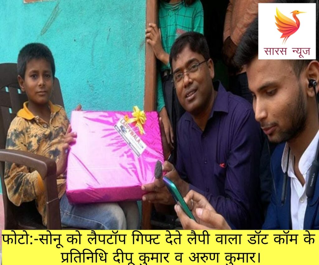 वहीं सोनू की पढ़ाई के लिए उसे टच स्क्रीन लैपटाप गिफ्ट किया गया है। पत्रकार अरुण कुमार मेहता की पहल पर पटना के लैपी वाला डाट कॉम की तरफ से रविवार को लैपटाप भेंट किया गया। लैपटाप देने पटना से लैपी वाला के प्रतिनिधि दीपू कुमार पहुंचे थे। सोनू लैपटाप पाकर बहुत खुश दिखा। उसने इससे संबंधित कई जानकारियां पूछीं। तत्काल ड्राइंग भी बनाकर पत्रकारों को दिखाया। इधर, पत्रकार अरुण कुमार मेहता ने सोनू की पढ़ाई के लिए क्राउड फंडिंग की भी शुरुआत की है। लोगों से एक रुपये देने की अपील अरुण ने की है।