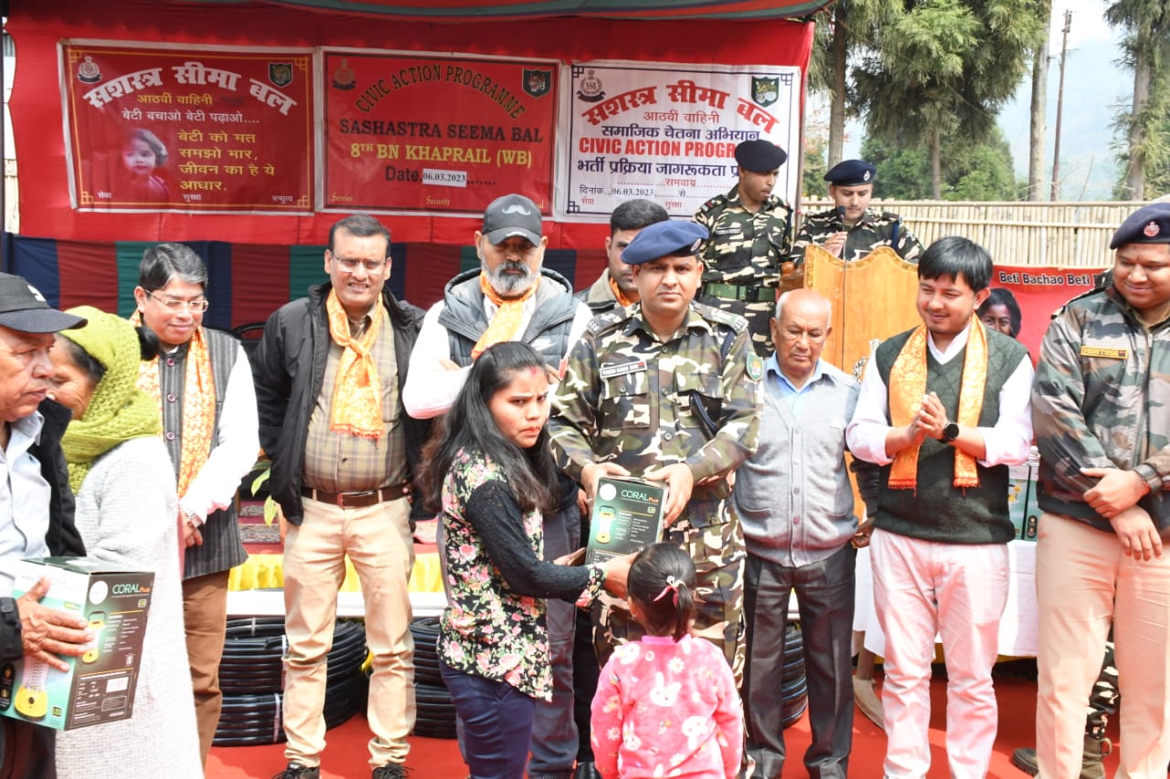इस दौरान स्थानीय कलाकारों ने खादा पहनाकर मुख्य अतिथि का स्वागत किया। इसके उपरांत योगेश कुमार सैनी, उप कमांडेंट ने बताया कि एसएसबी द्वारा इस कार्यक्रम के अंतर्गत टिंगलिंग, मेची एवं टोक्लोंग क्षेत्र के विद्यालय व क्लबों के बीच आज खेल – कूद के सामान का वितरण किया गया एवं सीमा चौकी खेरबानी व छोटाकोठी क्षेत्र के 45 ग्रामीणों को सोलर होम लाइट वितरण किया गया। इसके अलावा खेरबानी गाँव में जल संरक्षण हेतु सायंटेक्स पाइप आदि प्रदान किए गए व कार्यक्षेत्र की जनता व उनके पालतु जानवरों के स्वास्थ्य जांच व इलाज के लिए नि:शुल्क मेडिकल शिविर का भी आयोजन किया गया। एसएसबी की तैनाती से अब तक सरहद के लोगों की सुरक्षा के लिए एसएसबी हमेशा तत्पर रही है। हमारा उद्देश्य आप सभी का सर्वांगिक विकास करना रहा है, फिर चाहे वो बौधिक रूप से हो या सामाजिक रूप से हों या फिर शारीरिक रूप से किसी भी क्षेत्र के विकास के लिए स्थानीय लोगों का विकसित होना बहुत जरूरी होता है। भारत युवाओं का देश है। पूरे विश्व में सबसे ज्यादा युवां हमारे देश में है। ऐसे में इन युवाओं को शिक्षा व खेल – कूद के क्षेत्र में कुशल बनाना जरूरी है। इन्हीं बातों को ध्यान में रखते हुए एसएसबी युवाओं को आत्म निर्भर बनाने हेतु समय – समय पर रोजगार आधारित प्रशिक्षण जैसे कंप्यूटर ट्रेनिंग, ब्यूटीशियन ट्रेनिंग, एलईडी रिपेरिंग व बाइक रिपेरिंग आदि का प्रशिक्षण हर साल करवा रही है। इसके अलावा एसएसबी का उदेश्य है इस कार्यक्रम के माध्यम से खेल को बढ़ावा देना व हमारे कार्यक्षेत्र के जनता को दैनिक जीवन में होने वाली परेशानियों से निजात दिलाना है।