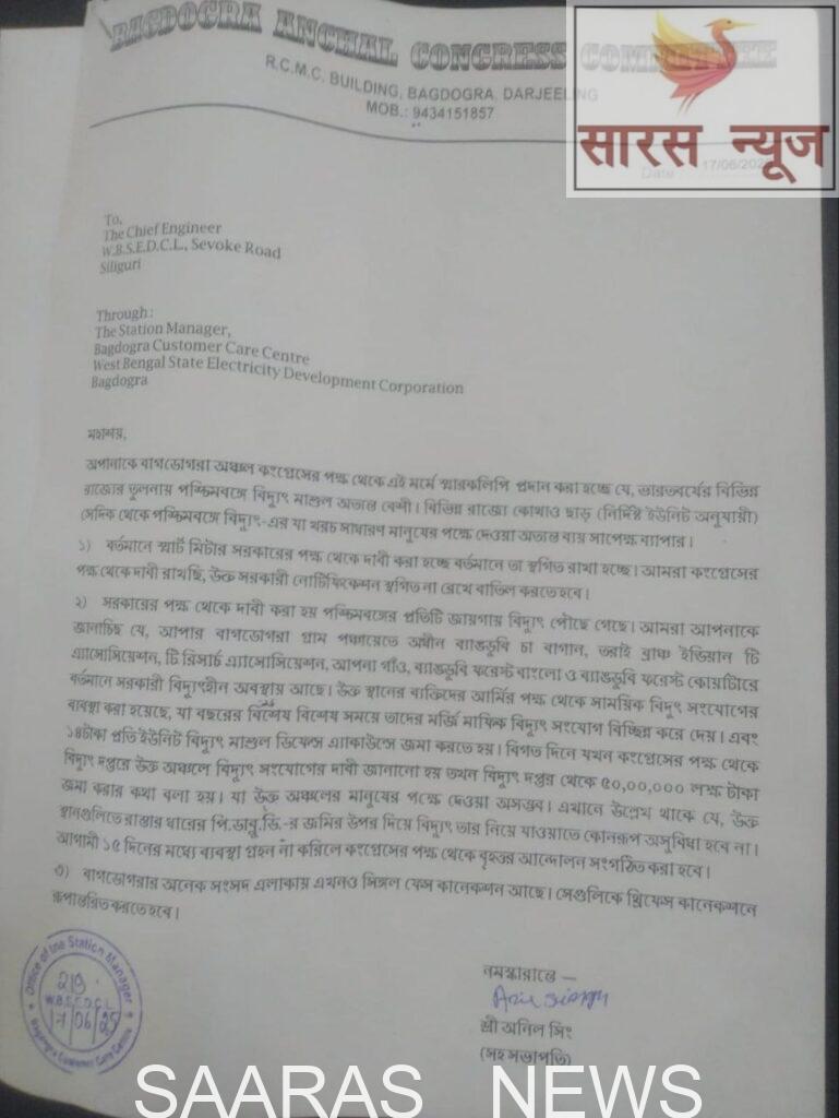 बागडोगरा अंचल कांग्रेस कमेटी की ओर से मंगलवार को मुख्य अभियंता पश्चिम बंगाल राज्य विद्युत वितरण कंपनी लिमिटेड (डब्ल्यूबीएसइडीसीएल) सिलीगुड़ी को एक पत्र सौंपा है। सौंपे गए पत्र के माध्यम से बताया गया कि पश्चिम बंगाल में बिजली की दरें भारत के अन्य राज्यों की तुलना से बहुत अधिक हैं। विभिन्न राज्यों में छूट (विशिष्ट यूनिटों के अनुसार) होती है, इसलिए पश्चिम बंगाल में बिजली की कीमत आम आदमी के लिए बहुत महंगी है। इसे कम किया जाएं। फिलहाल सरकार स्मार्ट मीटर कह कर रही है, लेकिन फिलहाल इसे टाला जाएं। कांग्रेस की ओर से मांग कर रहा है कि उक्त सरकारी अधिसूचना को निलंबित व रद्द किया जाए। इस संबंध में दार्जिलिंग जिला कांग्रेस के संयोजक अमिताभ सरकार ने बताया कि सरकार का दावा है कि पश्चिम बंगाल के हर गांव में बिजली पहुंच गयी है।