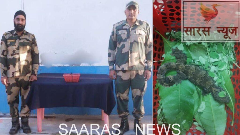 10 इंच लंबी छिपकली की दुर्लभ जंगली प्रजाति, एक बॉक्स के अंदर छिपी हुई थी, जिसे सतर्क बीएसएफ जवानों ने सीमा के पास लावारिस पाया।