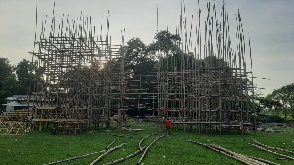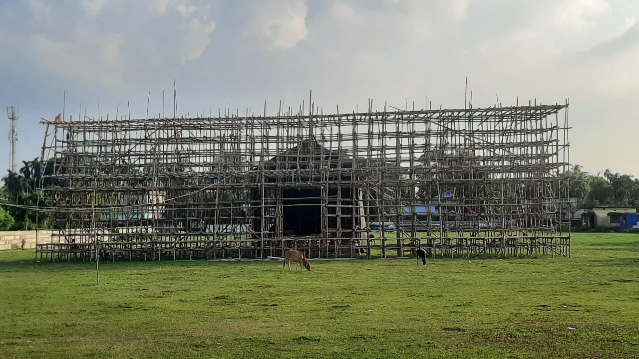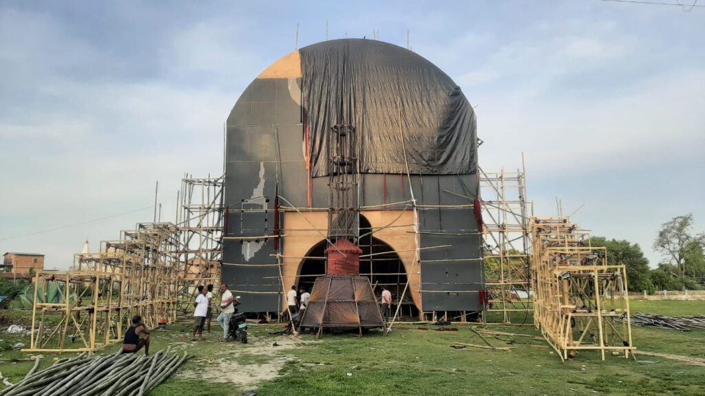 फोटो: बनाए जा रहे ‘बुनन थीम’ दुर्गा पूजा पंडाल पीएसए क्लब बतासी।