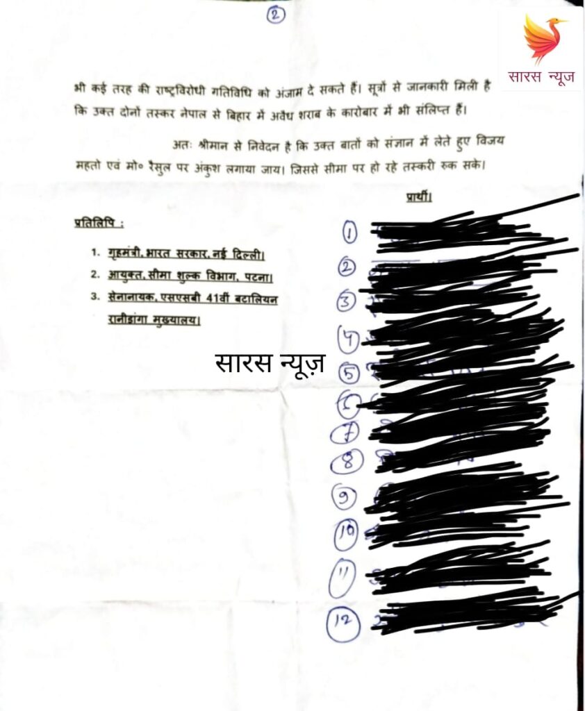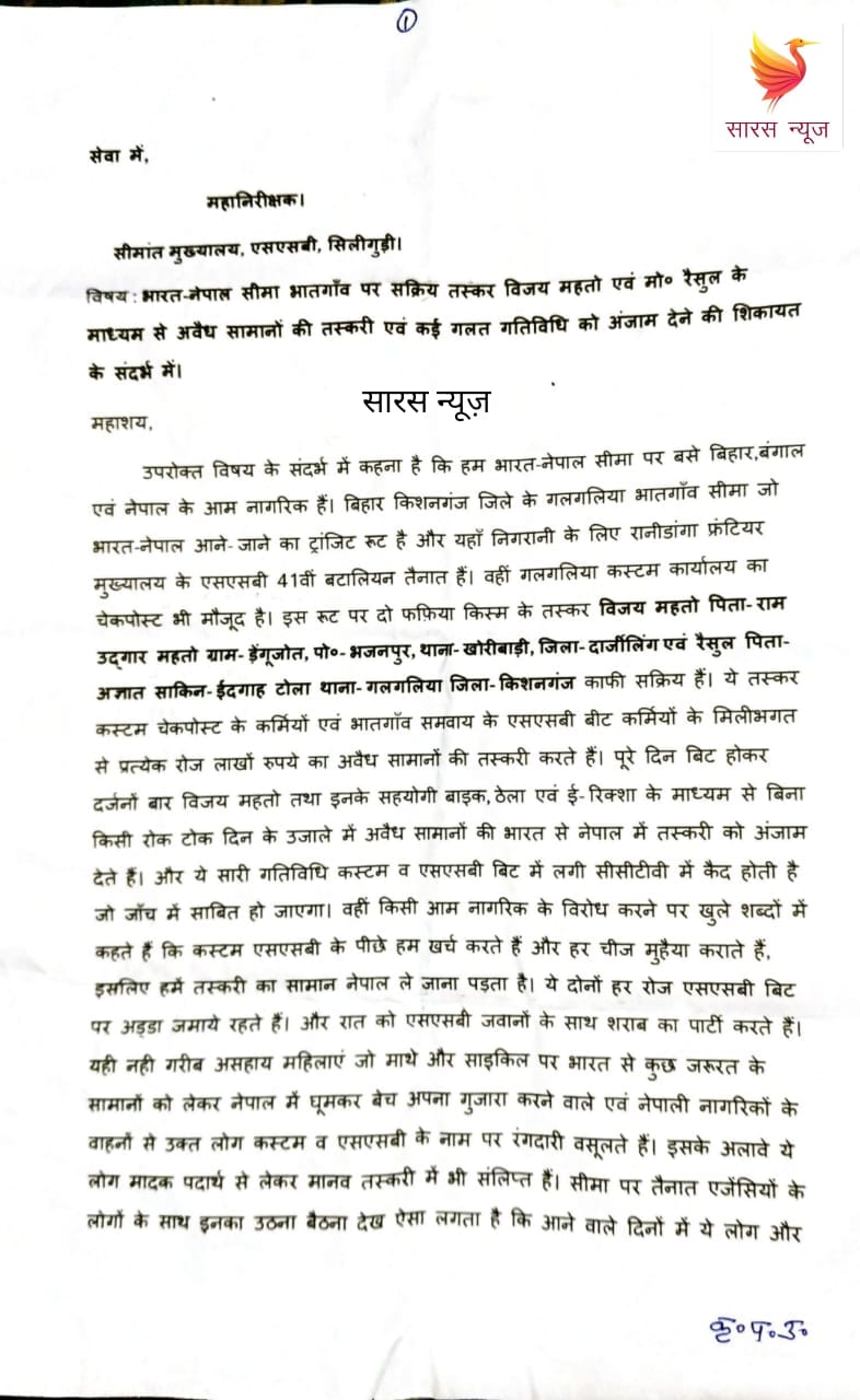 सारस न्यूज, सिलीगुड़ी: भारत- नेपाल सीमा गलगलिया भातगांव के ट्रांजिट रूट पर दो कुख्यात तस्करों के विरुद्ध सीमावासियों ने महानिरीक्षक सीमांत मुख्यालय, एसएसबी सिलीगुड़ी को लिखित शिकायत दी है। वहीं इस शिकायत की कॉपी गृहमंत्री, भारत सरकार, नई दिल्ली आयुक्त, सीमा शुल्क विभाग, पटना एवं सेनानायक, एसएसबी 41वीं बटालियन रानीडांगा मुख्यालय को देकर दोनों तस्करों पर अंकुश लगाने की मांग की है।