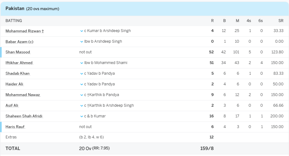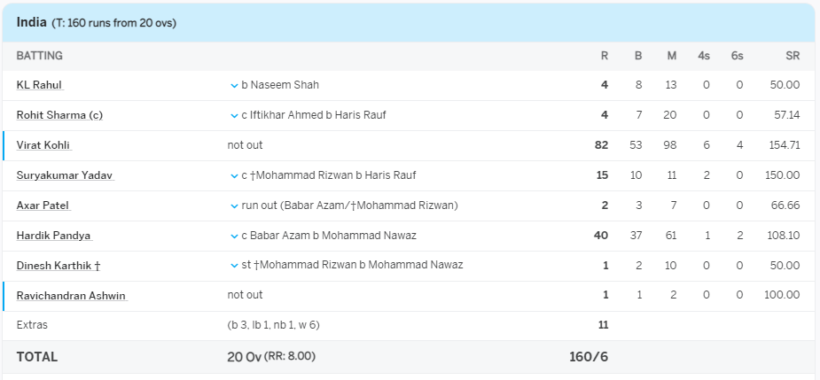 टी20 वर्ल्ड कप में आज भारत और पाकिस्तान के बीच मुकाबला खेला गया। ऐतिहासिक मेलबर्न क्रिकेट ग्राउंड पर दोनों टीमें करीब एक लाख दर्शकों के सामने खेल रही थीं। पहले बल्लेबाजी करते हुए पाकिस्तान ने 20 ओवर में आठ विकेट गंवाकर 159 रन बनाए। जवाब में भारत ने आखिरी गेंद पर छह विकेट गंवाकर मैच जीत लिया। भारत ने पाकिस्तान को सुपर-12 के अपने पहले मुकाबले में चार विकेट से हरा दिया है। विराट कोहली ने भारतीय फैन्स को दिवाली का तोहफा दिया है। विराट कोहली ने इस मैच में 53 गेंदों में 82 रन की नाबाद पारी खेली।